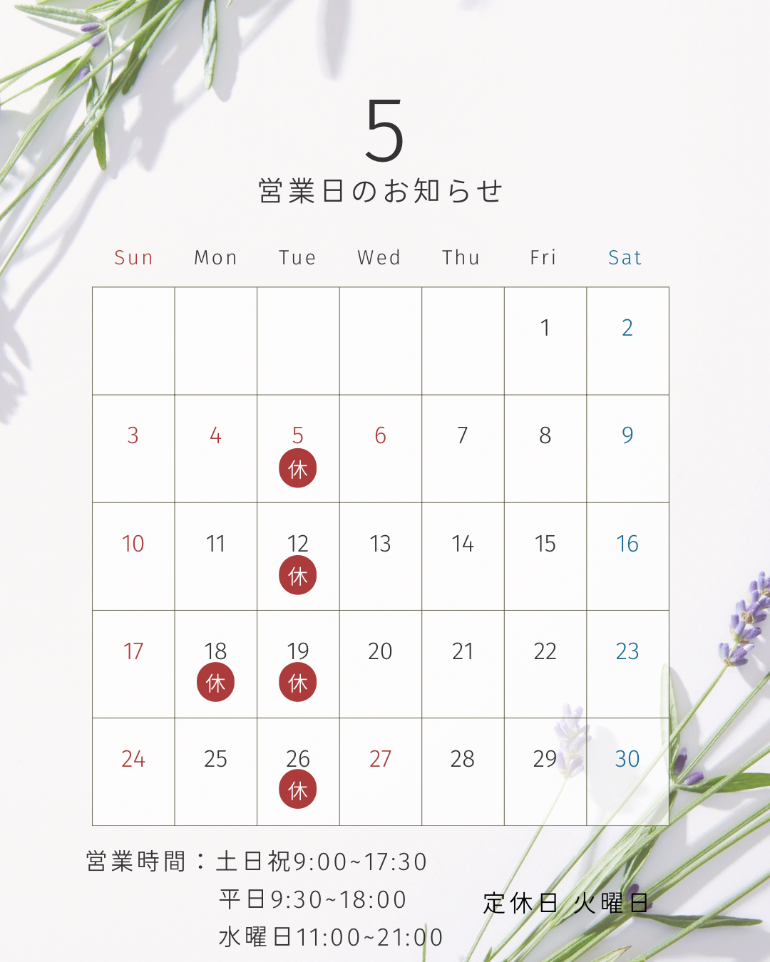 5月の営業日カレンダーです。